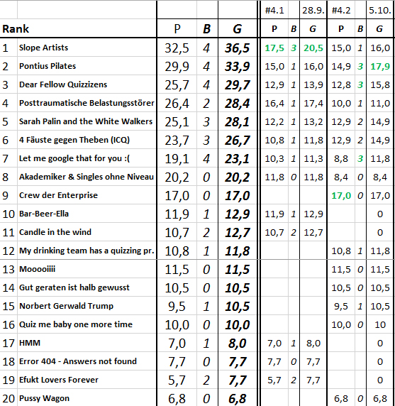 Das Ergebnis des 46. TRIBAUN-Quiz am 5. Oktober 2016, dem 2. der 4. Staffel.