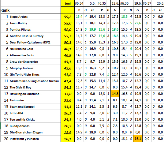 Ergebnis und Zwischenstand in der Quiz-Liga nach 34 Spieltagen und Zwischenstand in der Monatswertung Juni nach 2 von 4 Spieltagen: