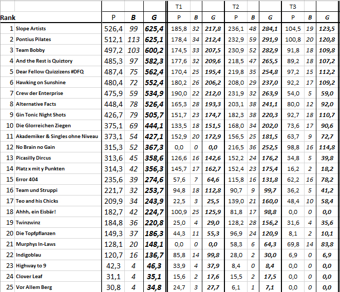 Insgesamt nahmen 39 Spieler aus oder in Österreich an der sechsten Ausgabe des "schriftlichen Weltquiz" von ÖQV-Obmann Stefan Pletzer teil, international waren es 166 Spieler aus 16 Ländern. Schön wären 80! :p
