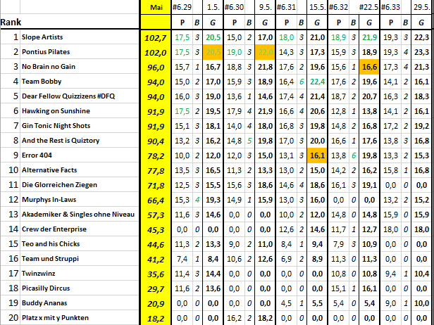 | 20 | Rainer Patzl | 40 | 6 | 3 | 3 | 8 | 6 | 5 | 6 | 3 |