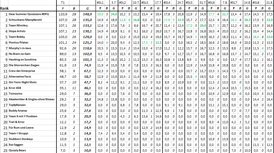 Ergebnis und Zwischenstand in der Sommer-Liga nach 8 von 13 Spieltagen:
