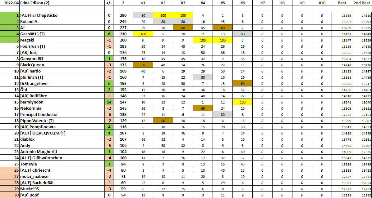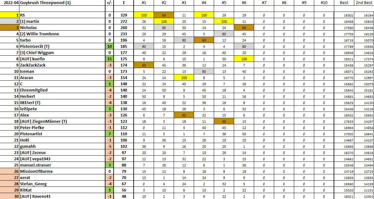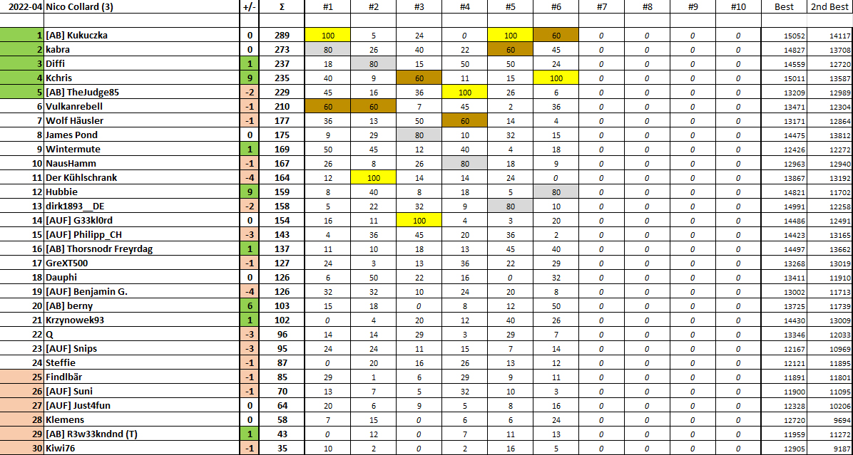 | 23 | Oliver Langreiter | 3488.18 | 461.44 | 470.43 | 393.61 | 425.41 | 542.54 | 359.44 | 499.48 | 335.83 |