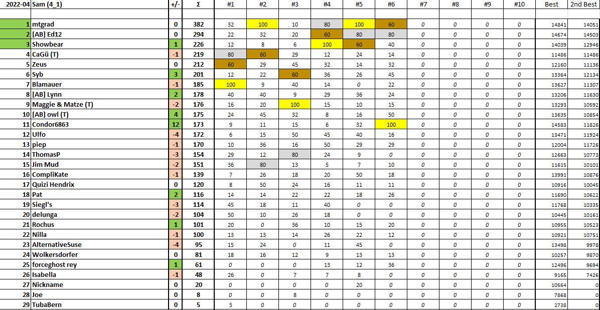 | 21 | Michael Renzler | 3779.18 | 495.41 | 683.65 | 388.69 | 519.45 | 384.61 | 426.68 | 450.13 | 430.56 |