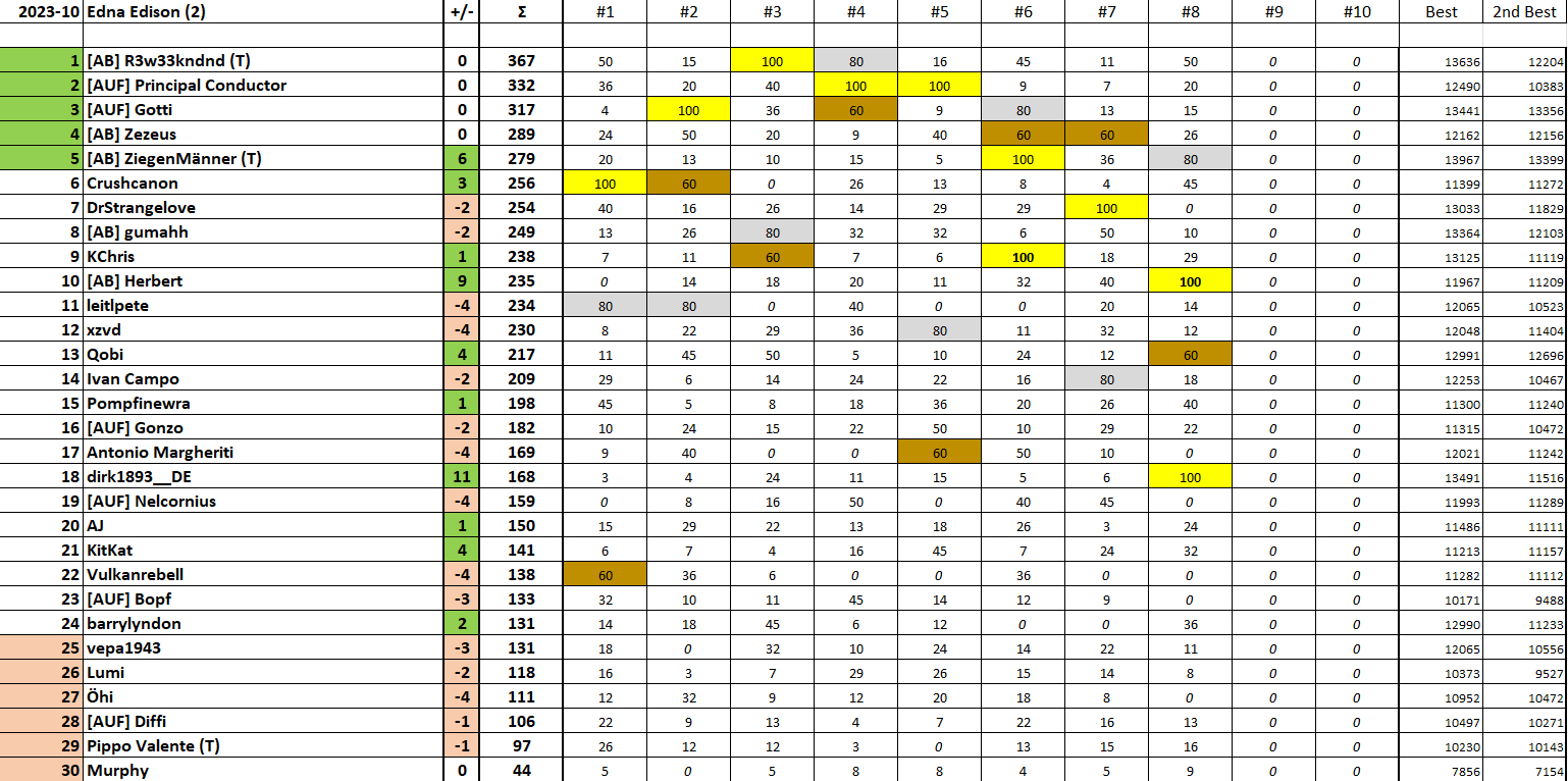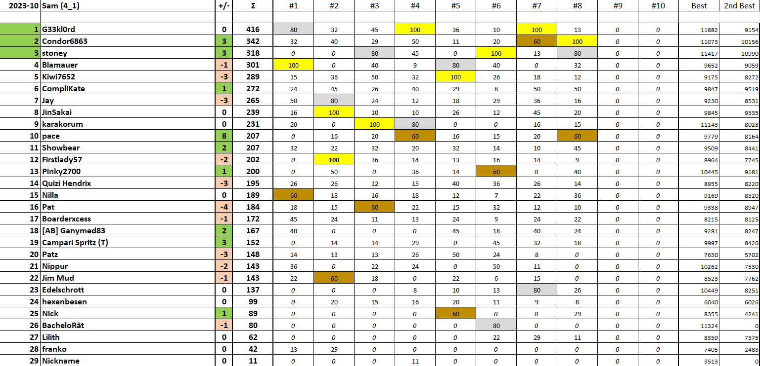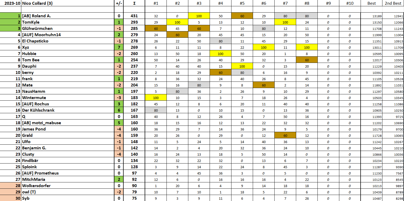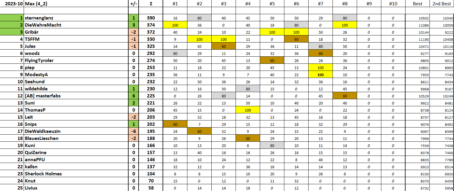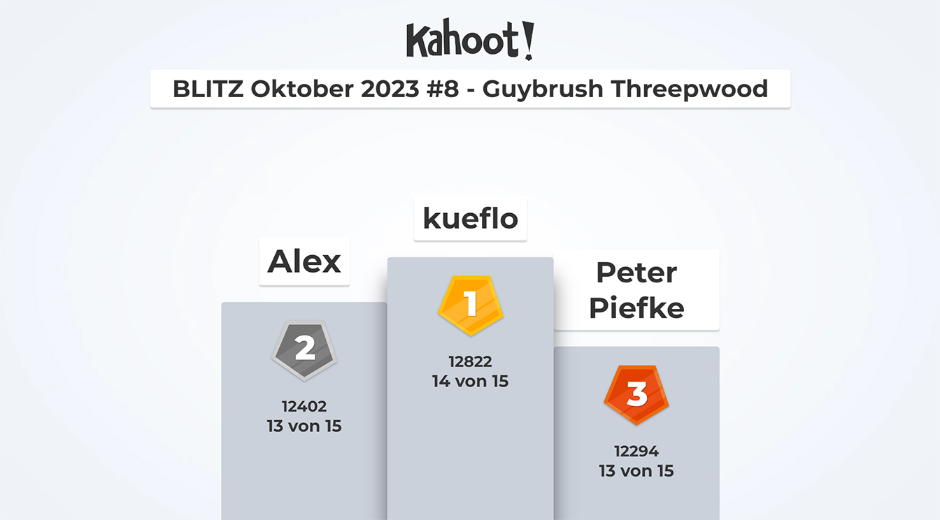 Herzliche Gratulation an die Sieger:innen von Runde 8 LIGA 1: kueflo (Gold), Alex (Silber), Peter Piefke (Bronze) LIGA 2: dirk1893__DE (Gold), Ziegenmäner*0.5 (Silber), Qobi (Bronze) LIGA 3-1: Xyz (Gold), Roland A. (Silber), Tom Bee (Bronze) LIGA 3-2: Chriescht (Gold), beelzo (Silber), Zeus (Bronze) LIGA 4-1: Condor6863 (Gold), stoney (Silber), pace (Bronze) LIGA 4-2: DieWahreMacht (Gold), Sternenglanz (Silber), masterfabs (Bronze)